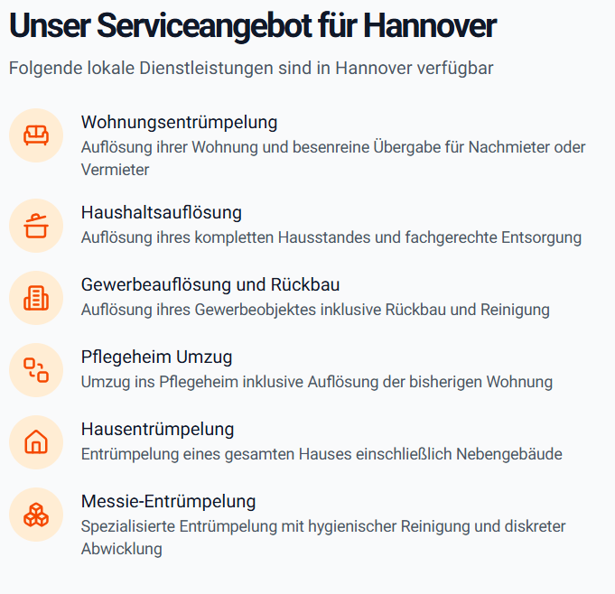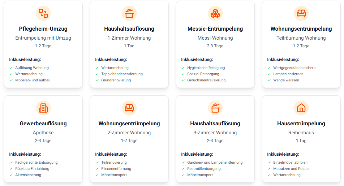 Die Kosten hängen von verschiedenen Faktoren ab: Größe der Räume, Menge des Entrümpelungsguts, Stockwerk, Parkmöglichkeiten und gewünschte Zusatzleistungen. Wir erstellen Ihnen gerne ein kostenloses und unverbindliches Angebot vor Ort.